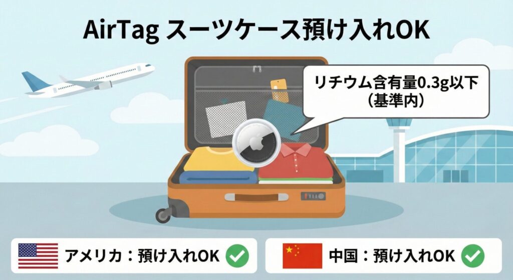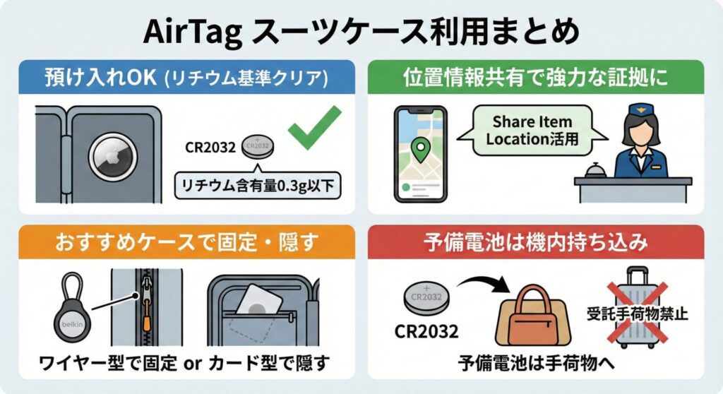 結論として、AirTagをスーツケースに入れて飛行機に預けることは、危険物規則上の要件を満たす限り、多くの航空会社で認められています