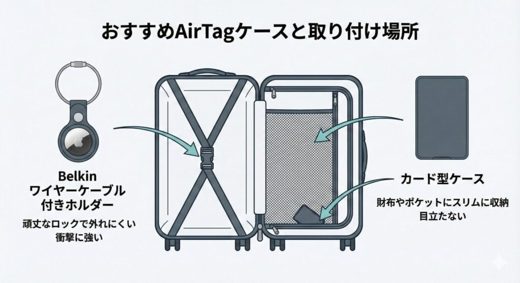 AirTagをそのままスーツケースに入れると、荷物に紛れて電波が悪くなったり、破損したりする可能性があります。